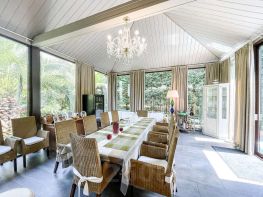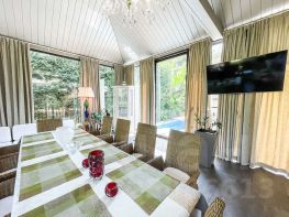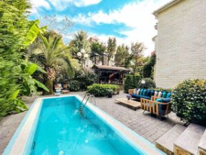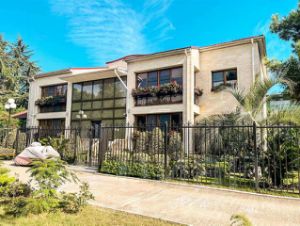 Первый этаж: кухня-гостиная с выходом на крытую террасу и зону бассейна, гостиная, детская с с/у и гостевая спальня. Второй этаж разделен на два отдельных входа: двухкомнатная квартира гостевая или для персонала и двухуровневая квартира с тремя спальнями и зоной отдыха на мансарде.