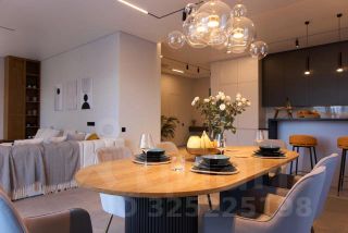 Дом полностью укомплектован мебелью и техникой. Использованы мягкие природные оттенки и монолитные поверхности, создающие цельный объём, в котором каждая зона ощущается завершённой.