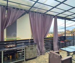 * 1 этаж: Просторная кухня-гостиная с выходом на собственную крытую террасу с французскими шторами.