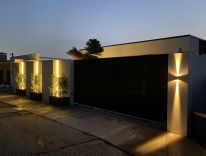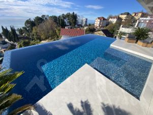Бассейн стоит на колоннах, линия инфинити на три стороны, размер основной чаши по внутренним стенам 4х10 глубина 1.65, зона лестницы 2.4х3.6. Облицован испанской стеклянной мозаикой, подсветка с выбором цвета, мощный противоток 80м3 в час. Обогрев, станция дозации, уф-лампа.