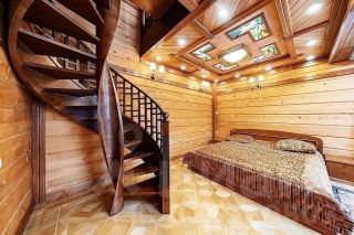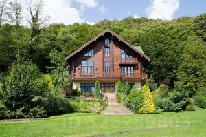 Дом построен из натурального дерева с использованием камня и кованых элементов. Интерьеры наполнены светом за счёт панорамных окон.