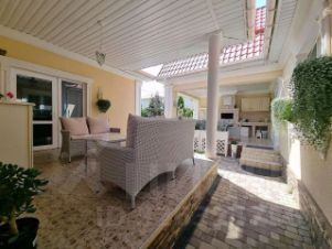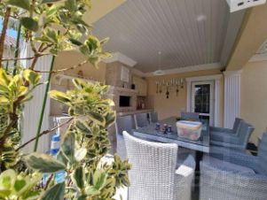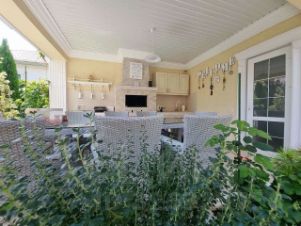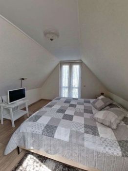 Общая площадь дома — 150 м². Рациональная планировка включает 5 жилых комнат, просторную кухню-гостиную, два санузла, а также мансардный этаж, где оборудована дополнительная спальня. Есть терраса, оборудованная под летнюю кухню, и собственная сауна — отличное решение для отдыха и приёма гостей.