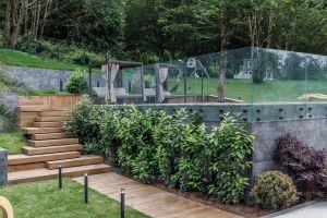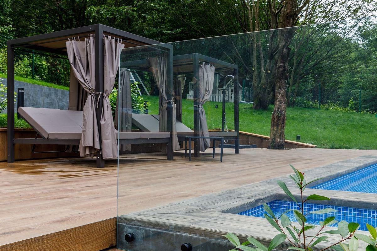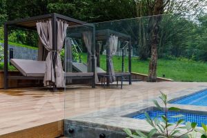 На участке сделано водоотведение, бассейн переливной на две чаши,