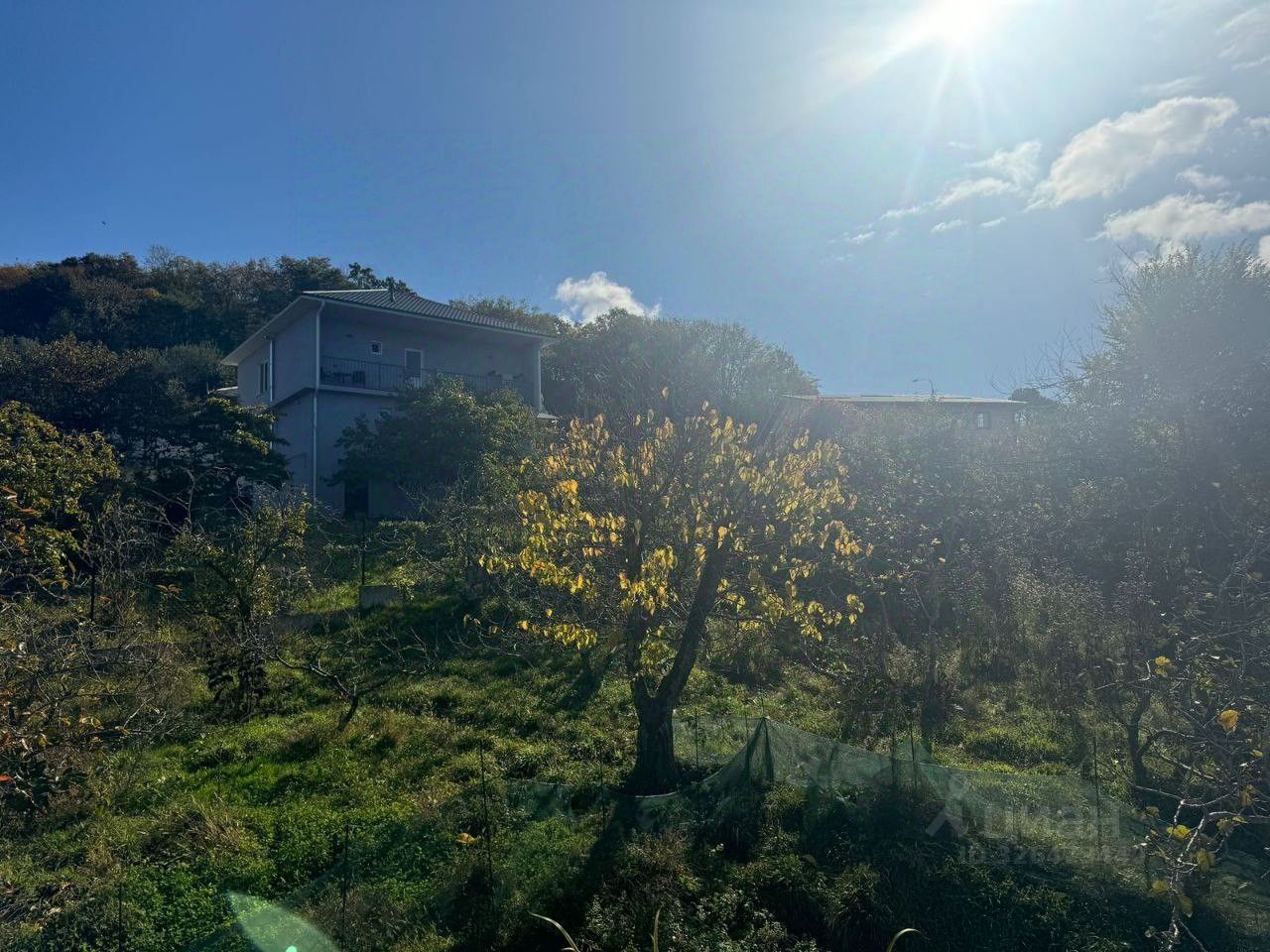 На участке растет разнообразный фруктовый сад, есть маленький летний домик.