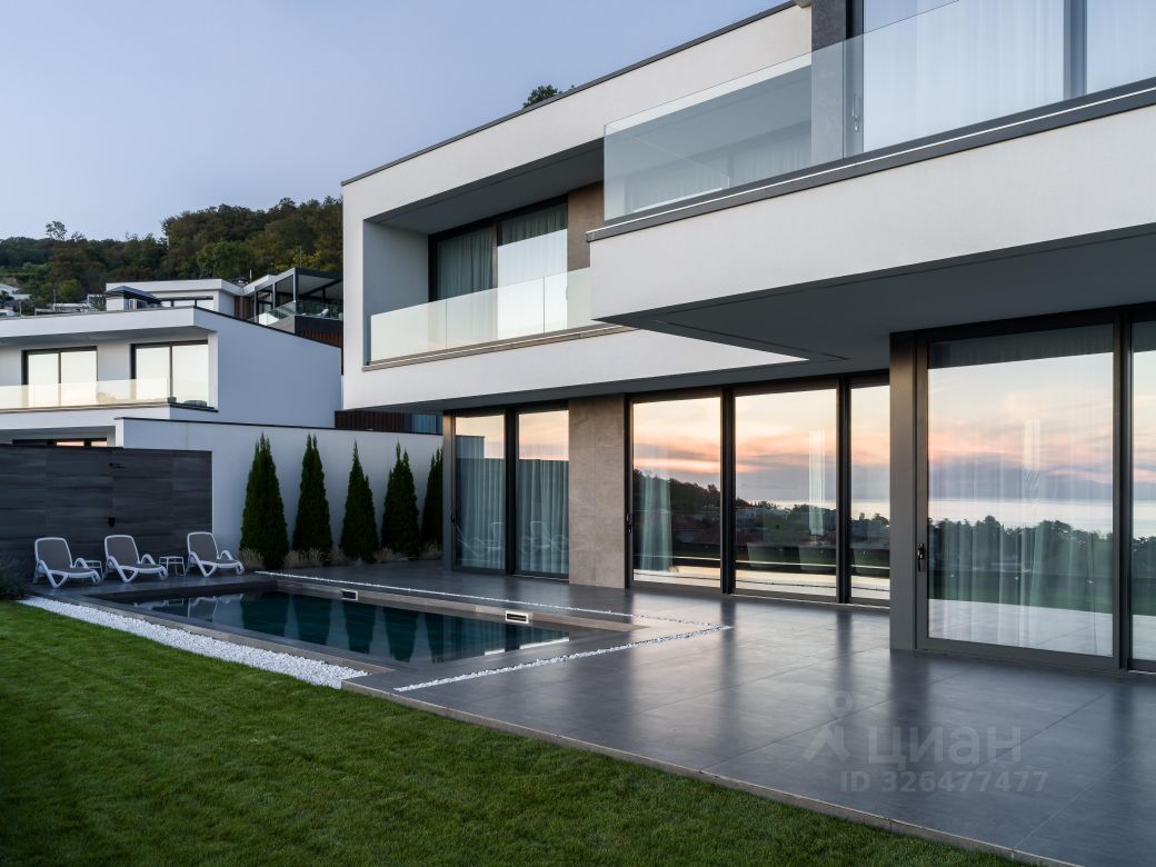 Участок 15 соток. На верхнем входная группа и автопарковка с навесом на 2 авто. На нижнем уровне переливной круглогодичный бассейн 9*3.5 метра с противотоком, отдельно гостевой блок с баней 35кв.м. Выполнено ландшафтное озеленение с автополивом