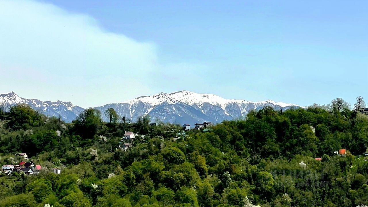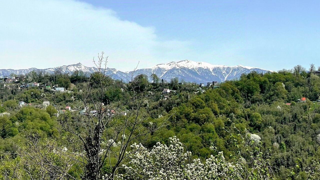 Хороший просторный вид на горы и снежные вершины, небольшой боковой вид на море, рядом небольшой лес, тихое спокойное и красивое место недалеко от Адлера со всеми коммуникациями рядом. На участке растут фруктовые плодоносящие деревья.