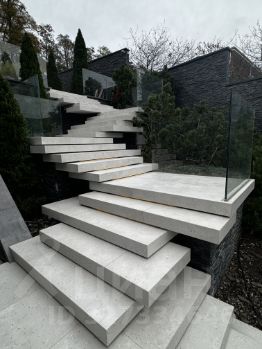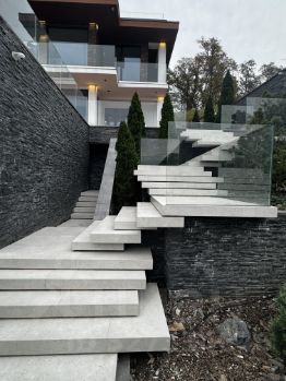 Все подпорные стены облицованы натуральным антрацитовым сланцем.