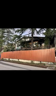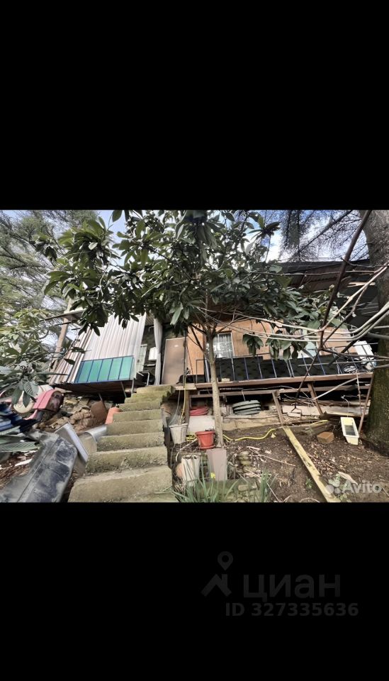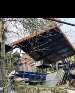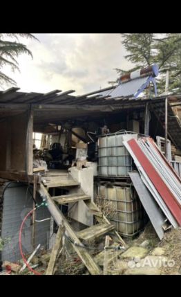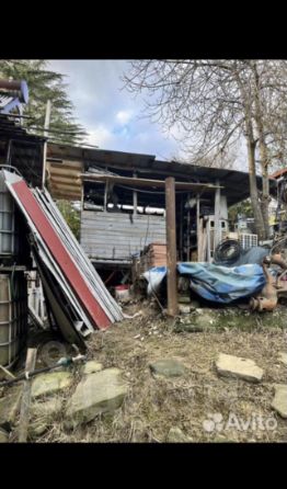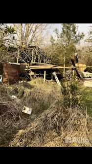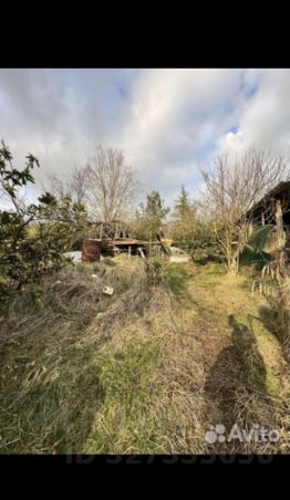 На участке растут плодородные деревья (лимон, мандарин, инжир, яблони, мушмула), стоит беседка с мангалом и два сарая.