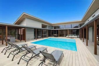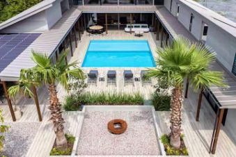 Зона отдыха с открытым бассейном и местом для барбекю.
