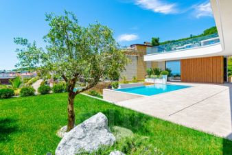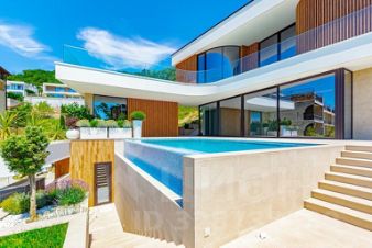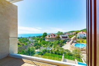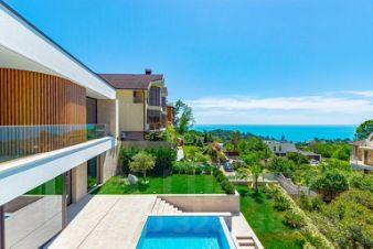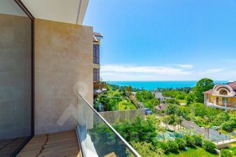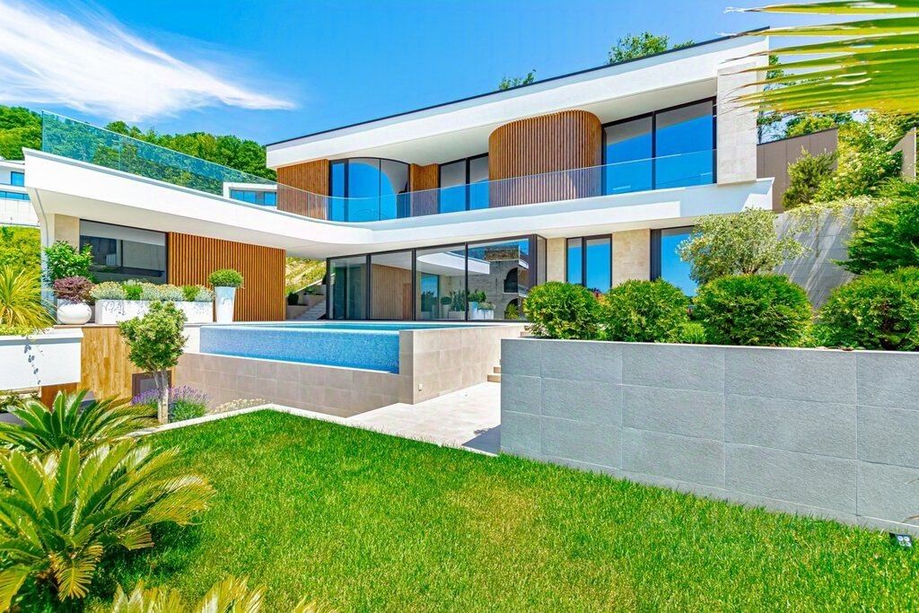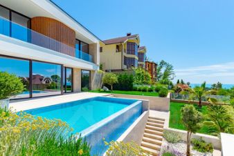 С виллы открывается прекрасный вид на море, в каждой комнате есть панорамные раздвижные окна с балконами, а из общей зоны кухни-гостиной через панорамные раздвижные окна можно выйти на просторную террасу к летней кухне, бане и бассейну.
