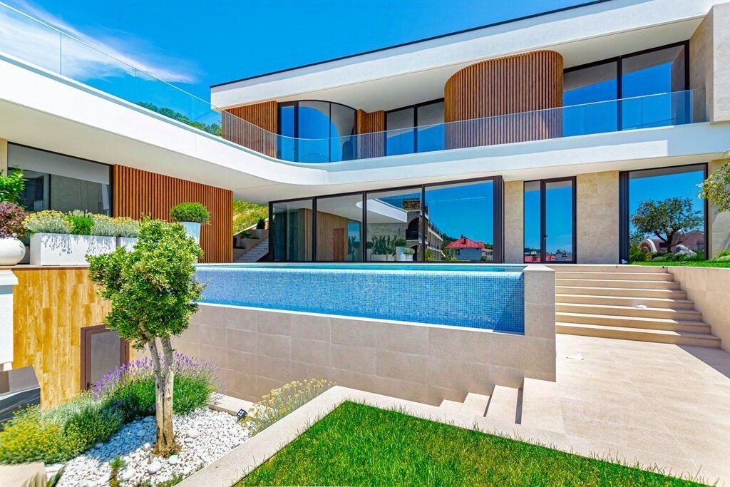 Ультра-современная архитектура с полным комплектом строительных чертежей ( строительство с строгим соблюдением проектной документации, с видео и фото фиксацией каждого этапа); отделка натуральными премиальными материалами; панорамные окна SCHUCO - раздвижные(автоматические) и полусферные системы.