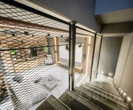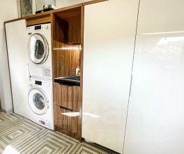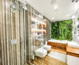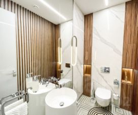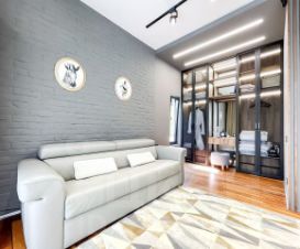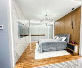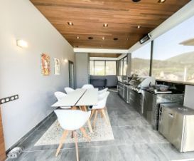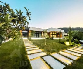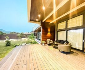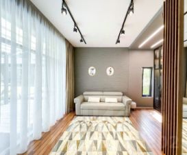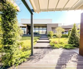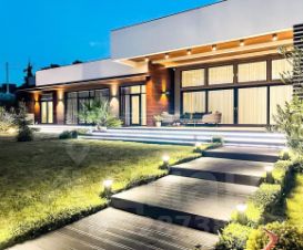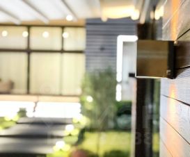 Планировка и дизайн дома объединяет внутреннее и внешнее пространство. Из каждой комнаты открывается свой уникальный вид. Фасад выполнен из термоясеня, отмостки выполнены террасной доской. Остекление - алюминиевый панорамный профиль Schuco. Усиленный фундамент позволяет поднять второй этаж в случае необходимости. Чтобы сделать пространство уединённым везде используются автоматические защитные экраны и маркизы. В доме расположились просторная кухня-гостиная с камином, главная спальня с гардеробом и своим санузлом, детская, тренажёрный зал, гардеробная.