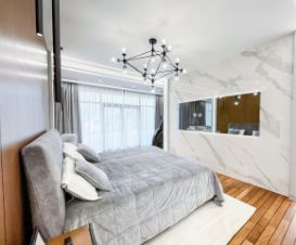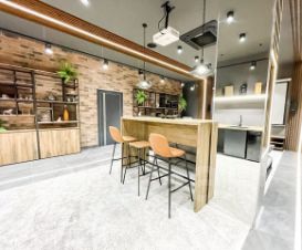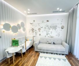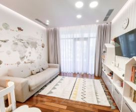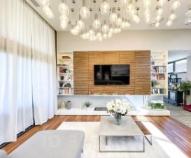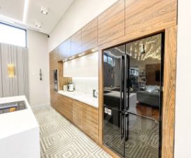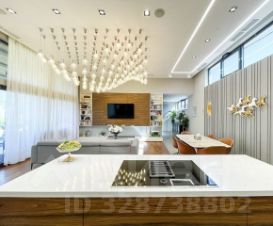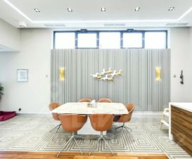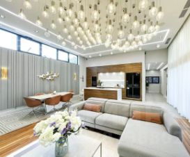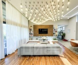 Вся мебель в доме от компании Bo concept и Claire, техника Miele, Samsung, smeg, neff. Кухня выполнена из полисандра, на полу выстелен тик, мозаика bisazza, панно на стене выполнено из окрашенного термоясеня. В доме установлена общая система кондиционирования. Освещению уделено отдельное внимание, дизайнерские светильники и люстры, многоуровневая подсветка для любого естественного освещения.