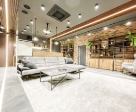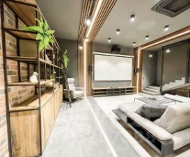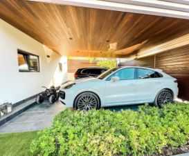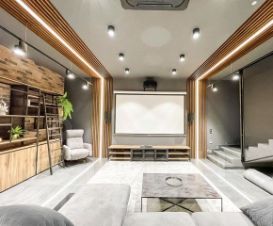 На участке также имеется дополнительное здание 150м2, в нем расположилась сауна из канадского кедра с брикетами гималайской соли, комната отдыха, летняя кухня и место притяжения - домашний кинотеатр с акустической и караоке-системой.