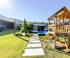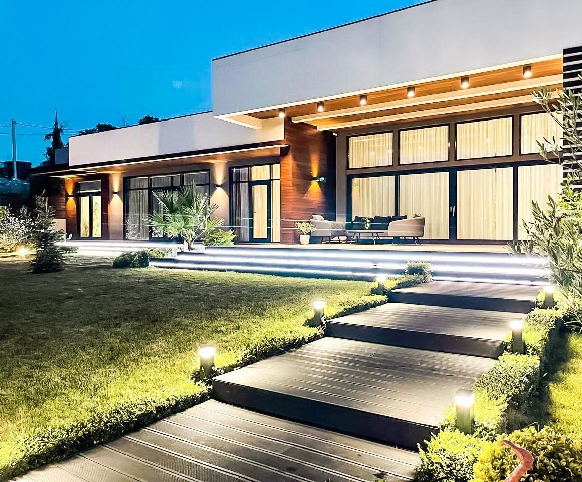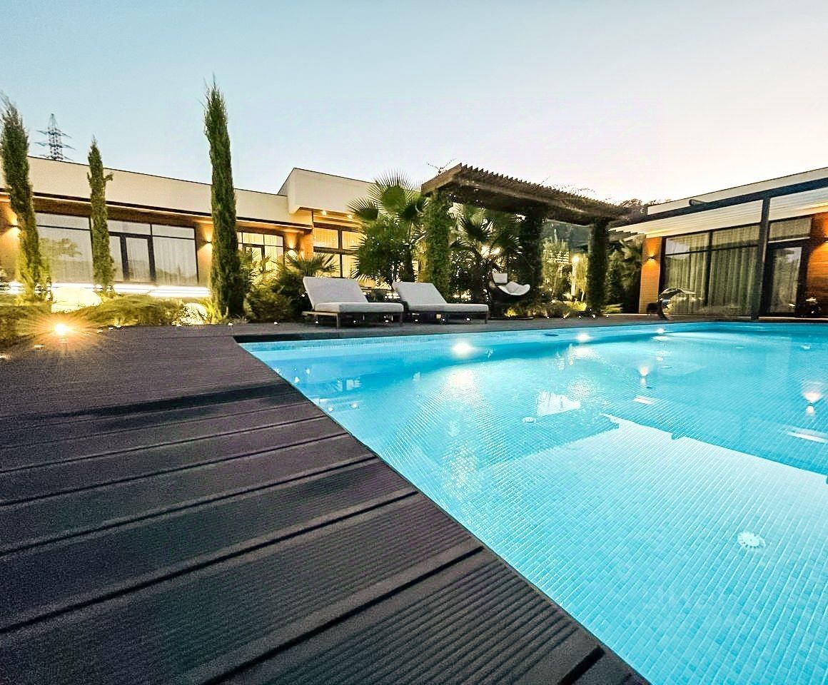На территории высажены ели, туи, яблони и инжир, разные сорта винограда, газон. Установлен автополив. За домом полисадник с ягодами и плодовыми деревьями. На территории расположен круглогодично подогреваемый бассейн и детская площадка. Установлена охранная система с датчиками движения, открытия, закрытия окон. Видеонаблюдение по всему периметру участка. Дом оснащён системой умный дом.