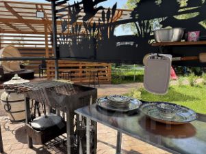 Представьте: вы выходите на веранду, а перед вами — панорама гор и моря. В доме тепло и светло даже в непогоду благодаря панорамным окнам. Вечером — дровяная баня, потом ужин у мангала с шампурами и тандыром, а после — тёплый подогреваемый бассейн под звёздами. Это не просто дом, а полноценное пространство для отдыха, где есть всё: от массажного кресла до игровой приставки.