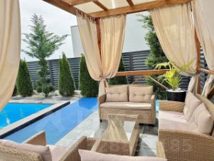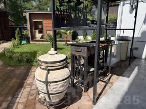 На участке две просторные перголы: одна с уличной мебелью, другая — у бассейна с ротанговым гарнитуром. Зона мангала с шампурами, тандыром, казаном и углями. Собственная дровяная баня. Подогреваемый бассейн работает в любое время года.