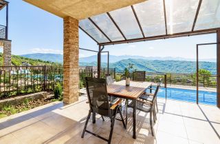 Терраса с большим столом и мангальная зона под навесом. Бассейн размером 6 на 3 метра с подогревом. Парковка. Видеонаблюдение по периметру.