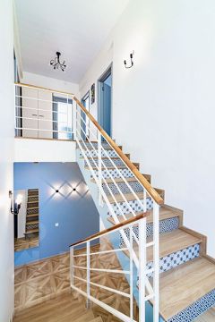 Второй этаж: две спальни с двуспальными кроватями. В одной есть раскладной диван полуторка, в другой — выход на террасу. Третья спальня с двухместным раскладным диваном. Общий санузел с ванной.