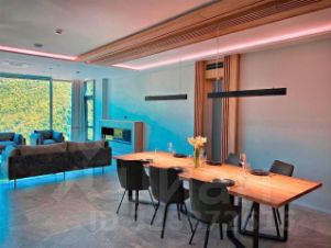 Современный дом встречает витражным остеклением в пол, из которого открываются завораживающие виды на заснеженные вершины. Внутри — гостиная с камином, объединённая со столовой, уютная кухня с кладовой, кабинет, спальни, три санузла и гардеробные. Мастер-спальня имеет свой гардероб и санузел, а тёплый пол согревает каждый уголок. Отделка, мебель и аксессуары созданы по дизайн-проекту с использованием лучших материалов, собранных по всей России и привезённых из Европы. Деревянные конструкции — от поставщика Скай-Парка.