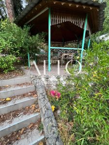 За домом на участке беседка и мангальная зона в окружении зелени, растут лимоны, грэйпфруты, петрушка, базилик.