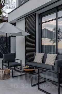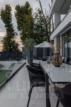 Терраса с обеденной зоной с видом на море. Выход из кухни к мангалу и саду с кулинарными травами и клубникой. Зона очага для вечерних посиделок.