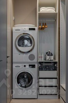 Постирочная комната: стиральная и сушильная машины, парогенератор для ухода за одеждой, пылесос и другой инвентарь для уборки.