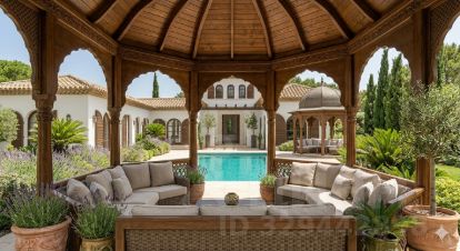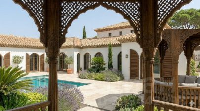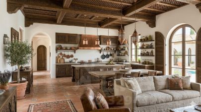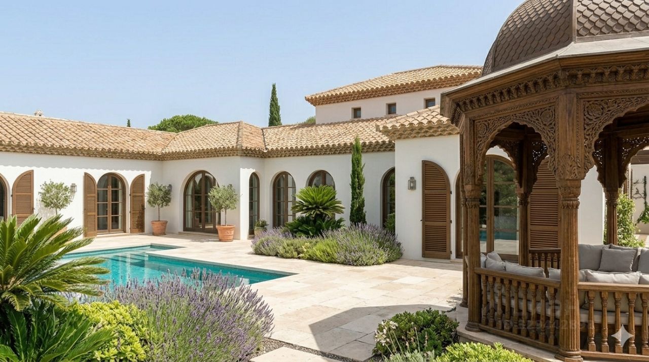 Архитектурный шедевр: Одноэтажное пространство с высокими сводами, арочными окнами и аутентичной отделкой. Фасад в светлых тонах и черепичная крыша идеально вписаны в южный ландшафт.
