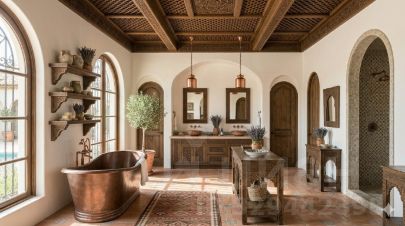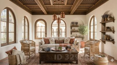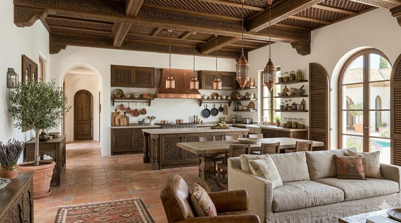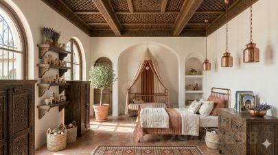 Интерьер в стиле Quiet Luxury: Ремонт выполнен в благородных серо-зеленых тонах с использованием натурального дерева, камня и терракоты. Резные кессонные потолки ручной работы — доминанта каждой комнаты.
