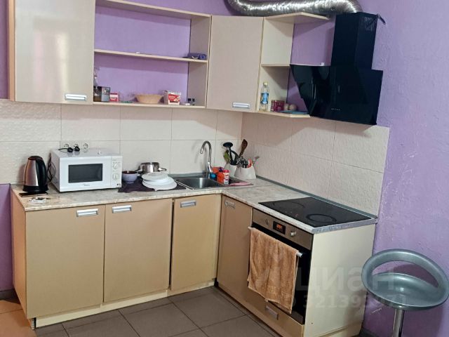 3. Выделенная обеденная зона. Оборудованная кухня в современном стиле: холодильник, встраиваемая варочная панель, встраиваемая вытяжка, микроволновая печь, чайник, посуда для приготовления, столовая посуда и приборы, кухонные принадлежности.