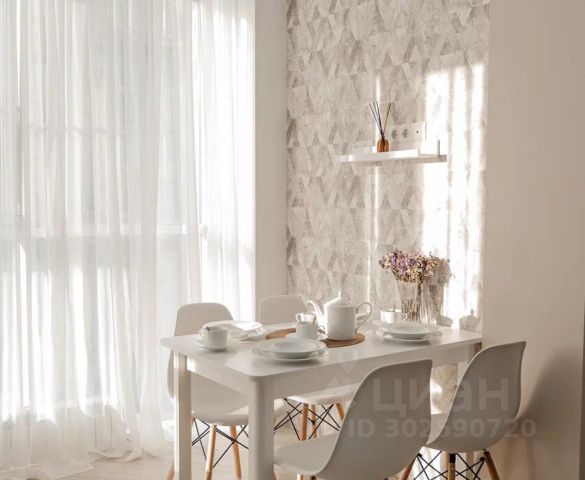 2. Выделенная обеденная зона с барной стойкой и высокими стульями. Оборудованная кухня в современном стиле: холодильник, встраиваемая варочная панель, встраиваемая вытяжка, микроволновая печь, чайник, посуда для приготовления, столовая посуда и приборы, кухонные принадлежности.