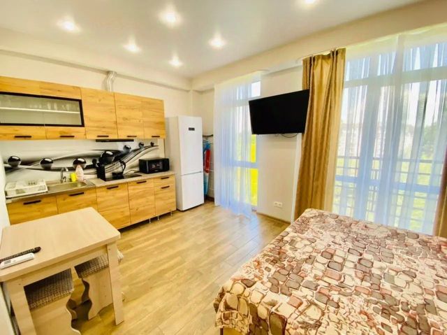Кухня-гостиная оборудована обеденным столом, угловым диванчиком, газовой плитой, вытяжкой, кондиционером, микроволновой печью, холодильником, электрическим чайником, телевизором, всеми необходимыми кухонными приборами, сковородами, кастрюлями, посудой и столовыми приборами.
