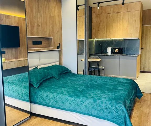 Кухня-студия: диван-кровать (2спальн),обеденный стол, 4 стула,ТВ, холодильник, кондиционер,эл.чайник, микроволновка, варочная панель на 3 комф,посуда,приборы, сковородки, полотенца