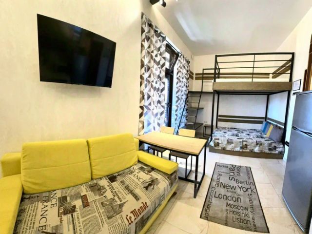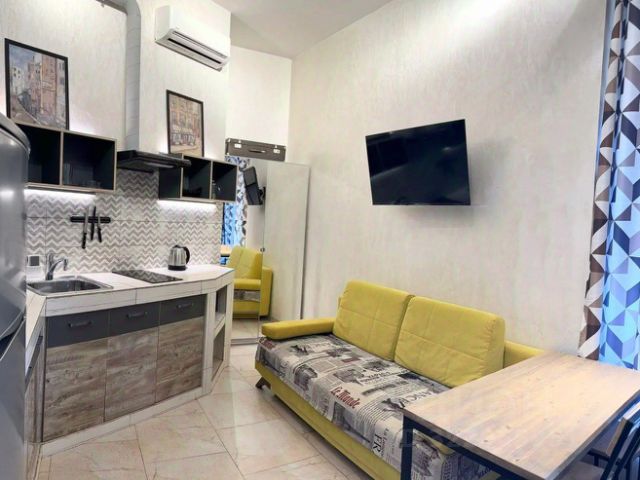 В студии установлено: Душ + туалет.Стандартно - большая 2-х спальная кровать, + по запросу дополнительная 1 спальная кровать. Кухня с микроволновкой, чайник, мини-холодильник, шкаф, вешалки для одежды, зеркало, сушилка для белья, сейф, фен.