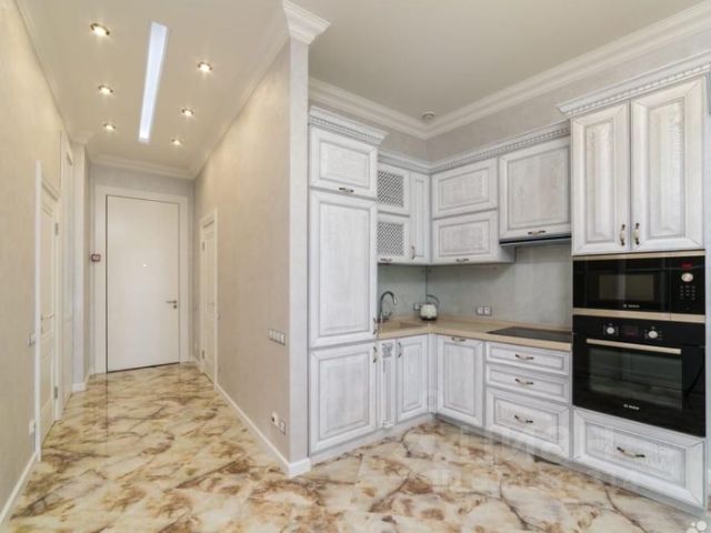 Кухонная зона оснащена вместительным холодильником, посудомоечной машиной, индукционной плитой, духовым шкафом, кофеваркой, шкафами, всеми необходимыми кухонными приборами, сковородами, кастрюлями, посудой и столовым приборами.