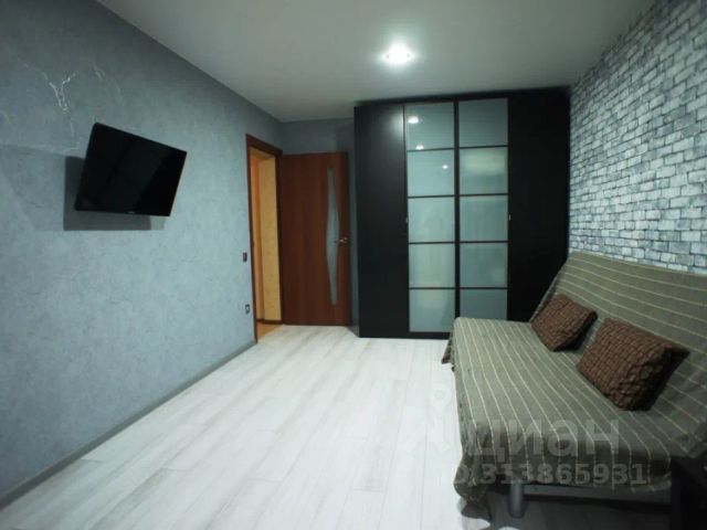 Одна комната. В комнате 2 кровати (2-спальная и 1,5-спальная), стол, 3 табурета, комод для вещей, этажерка для обуви, зеркало, вешалка для одежды с плечиками, кухонный шкаф и тумбочка.