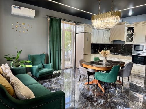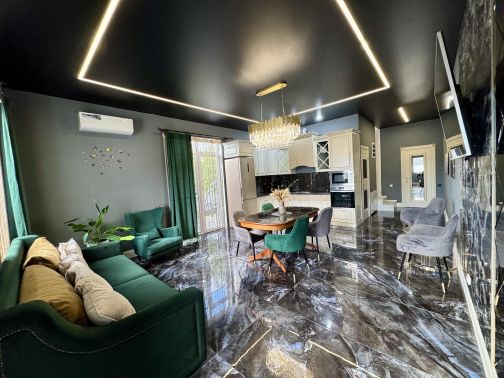 прихожая с зеркалом в полный рост и гардеробом, кухня-гостиная, зона ТВ, санузел и прачечная(стиральная машина, сушильная машина, гладильная доска и утюг), отдельный выход на террасу и к бассейну, лестница на второй этаж с сенсорной динамической подсветкой;
