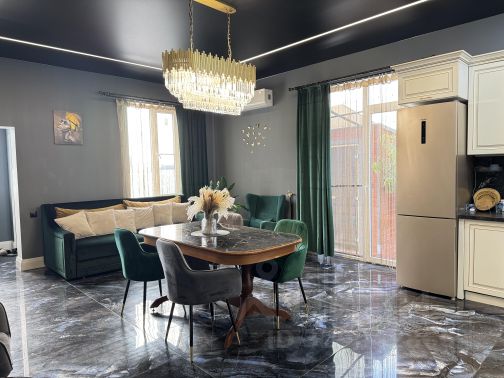 - кухня с посудомоечной машиной, варочная панель, духовой шкаф, СВЧ печь, чайник, капсульная кофе машина, вытяжка, фильтр для чистой питьевой воды, измельчитель и винный шкаф с двумя зонами. Комплект посуды и все для приготовления еды и сервировки. Большой обеденный стол из натурального дерева и барная стойка;