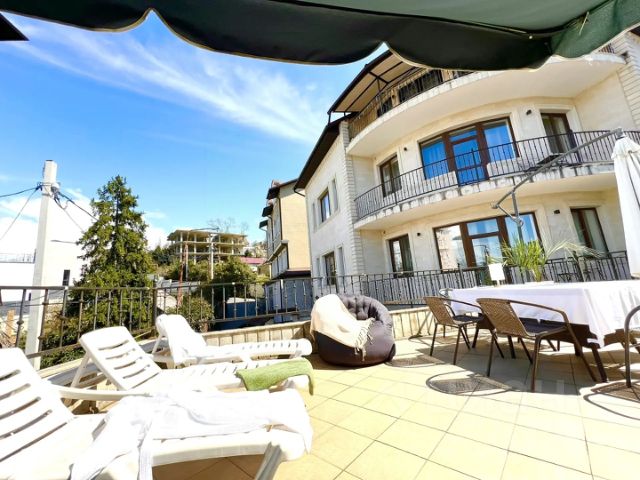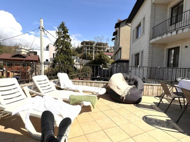 Гостевой домик у моря (700 метров до пляжа) в г. Сочи, район Центральный, на ул. Политехнической возле санатория "Беларусь". Рассчитан на 2-3 семьи, можно с детьми (6-7 человек). На первом этаже небольшая гостиная с двуспальным диваном под лестницей, отдельная спальня с двуспальной кроватью и санузел с просторной душевой. На втором этаже спальня с шикарной кроватью 180 х 220, санузел со стиральной машиной и кухня со всеми нужными бытовыми приборами. У домика нет своего двора, но на втором этаже вас порадует терраса с умопомрачительным видом на море и зоной барбекю. Вся жизнь отдыхающих проходит на этой террасе. До моря 700 метров. Лучший городской пляж Сочи "Альбатрос". Бесплатный. Единственный пляж с тёмным вулканическим песком и мелкой галькой. Нет огромных булыжников. Что очень удобно для отдыха с детьми. Напрокат есть лежаки (в 2,5 раза дешевле, чем на пляжах Маяк и Ривьера). В доме установлены кондиционеры (сплитсистемы). Есть дополнительные кровати. Полотенца: пляжные, банные. Качественное постельное белье. Все для отличного отдыха. Это тихое укромное место недалеко от резиденции "Бочаров ручей" для семейного отдыха с детьми (стульчик для кормления, горшок, игрушки, кроватка-манежик, ограничитель для лестницы). Рядом нет развлекательных и увеселительных заведений. Только магазины, вкусная пиццерия и тёплое ласковое море. Остановка транспорта в 200 метрах от дома (3 минуты ходьбы). До центра города (парк Ривьера, центральная набережная, Морвокзал, яхты, развлечения, рестораны) 10 минут на маршрутке. Возможность парковки возле дома есть. Внимание! Курение только на террасе!!! Стоимость проживания: Май с 16 числа цена - 8000 руб. в сутки. Июль до 20 числа - 9000 руб. в сутки. С 21 июля до 20 сентября - 10000 руб. в сутки. с 21 сентября по 20 октября - 9000 руб. Цена за весь дом. (максимум 7 чел. с детьми, за последующих доплата.