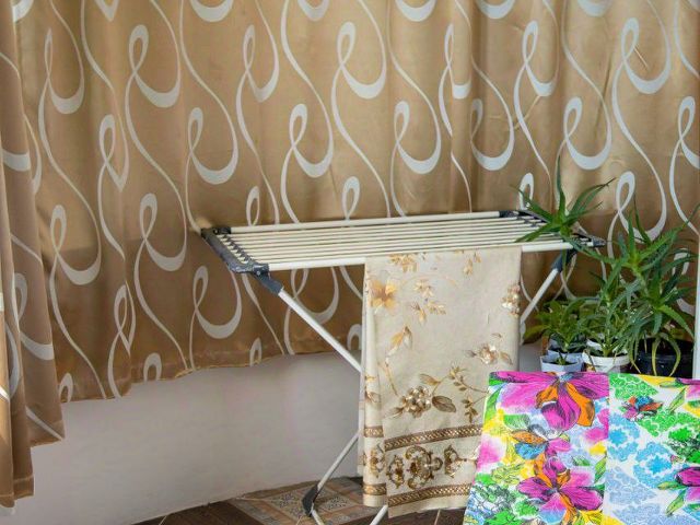Одна комната. В комнате 2 кровати (2-спальная и 1, 5-спальная), стол, 3 табурета, комод для вещей, этажерка для обуви, зеркало, вешалка для одежды с плечиками, кухонный шкаф и тумбочка.