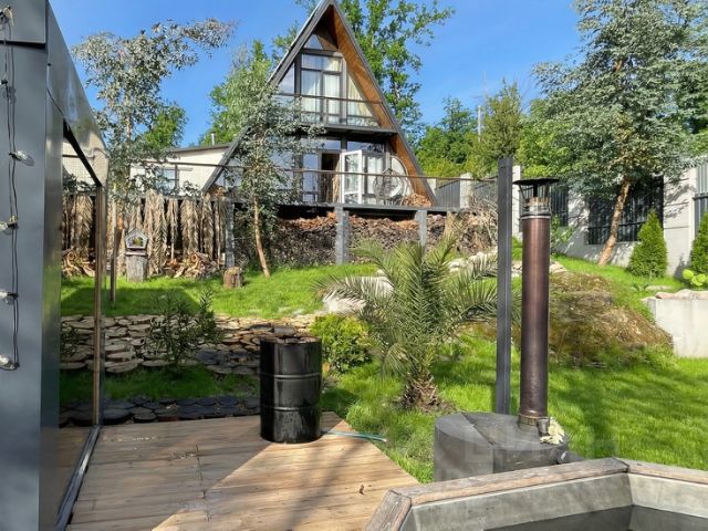 Во дворе находится зона отдыха с летней кухней, мангалом, обеденным столом и качелями, где можно наслаждаться отдыхом в любую погоду, по утрам завтракать, а вечером на мангале приготовить вкусный ужин и приятно провести вечер в кругу семьи и друзей. Также на участке есть гидромассажное джакузи с подогревом под открытым небом.