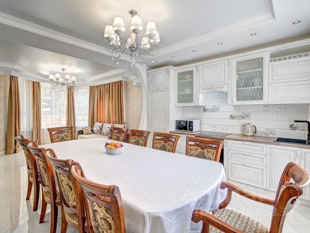 Кухня-столовая площадью 30 кв.м. (4, 6*6, 6м) в современном стиле на 10 мест. Стол 2, 4*0, 9м. Маленький не раскладной диван. Оснащение: газовая плита, раковина, столовая посуда, бокалы, стаканы, рюмки, капельная кофеварка, турки, чайник, посудомоечная и стиральная машины, большой холодильник и морозильная камера. Смарт-телевизор диагональю 65 дюймов. В гардеробной зоне есть большое зеркало, фен, гладильная доска, утюг.