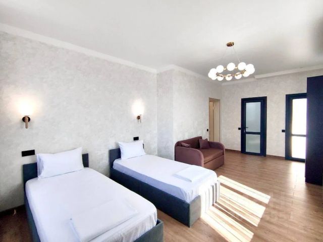 Новая просторная квартира 45кв.м. евродвушка в семейном апарт-отеле для 3-5 гостей. В квартире спальня с двуспальная кровать или 2 раздельные кровати с профессиональными ортопедическими матрасами и кресло кровать. Раскладной диван в столовой комфортно разместит дополнительно 1-2 взрослых или детей. Дополнительно можем предоставить раскладушку (места хватит) Для всех гостей белоснежное постельное белье и набор полотенец. А также шкаф, тумбочки, трюмо с зеркалом, ТВ, кондиционер, фен. Кухня-столовая в апартаменте полностью оборудована всем необходимым: большой холодильник, индукционная плита, микроволновка, чайник и полный набор посуды. Вы почувствуете себя как дома, имея все необходимое под рукой. Современный санузел с душем, стиральная машинка квартире. Так же есть гладильная доска, утюг, сушилки. На просторной террасе у квартиры есть индивидуальная зона для отдыха со столиком и стульями, где вы можете на свежем воздухе выпить чашечку кофе или бокал вина наслаждаясь прекрасной погодой и субтропической зеленью вокруг. В шаговой доступности центральный пляж (7 мин), Гипермаркет Магнит, центральный рынок, Олимпийский парк, Южный парк., тц Мандарин. Прогулочная набережная вдоль реки переходящая в морскую центральную набережную Адлера.