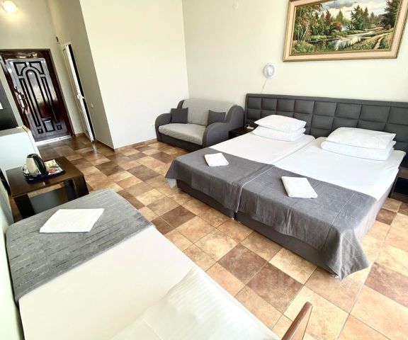 Resta Hotel - идеальное место для отдыха в Сочи. Отель расположен в пешей доступности от Олимпийского парка, в 2 км от морского побережья, что позволяет гостям насладиться красотами города. Так же в 10 минутах ходьбы ж/д Имеретинский откуда 3 раза в день направляется современная электричка в Горные курорты Красная Поляна и Роза-Хутор. К услугам гостей предоставляются комфортабельные номера на 2-3-4 человек, оснащённых необходимой современной техникой (холодильник, электрический чайник, кондиционер и фен), косметическими принадлежностями, халатами и тапочками. На территории отеля имеются места для парковки автомобиля и летняя "lounge" зона, бесплатный Wi-Fi, а также возможность заказать завтрак в номер. Благодаря удобному расположению, гости могут легко добраться до любой точки города. Недалеко от отеля находится Сочи-Парк с развлечениями и дельфинарием для детей и взрослых, рестораны, олимпийская набережная, а так же граница с Абхазией расположенная в 3х километрах от отеля. Resta Hotel - это идеальное место для тех, кто хочет провести незабываемый отдых в Сочи с комфортом и удобством. кондиционер и фен), косметическими принадлежностями, халатами и тапочками. На территории отеля имеются места для парковки автомобиля и летняя "lounge" зона, бесплатный Wi-Fi, а также возможность заказать завтрак в номер. Благодаря удобному расположению, гости могут легко добраться до любой точки города. Недалеко от отеля находится Сочи-Парк с развлечениями для детей и взрослых, рестораны, олимпийская набережная, а так же граница с Абхазией расположенная в 3х километрах от отеля. Resta Hotel - это идеальное место для тех, кто хочет провести незабываемый отдых в Сочи с комфортом и удобством. Просторный двухкомнатный номер, который имеет гостевую зону с рабочим столом и спальную зону с большой двуспальной кроватью или раздельными кроватями (30 кв.м.). В номере душевая кабина с косметическими средствами, фен, тапочки, халат, холодильник, телевизор, кондиционер и очиститель воздуха.