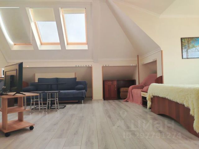 Апартаменты представляют из себя объёмную студию с большим панорамным остеклением что предает абсолютную насыщенность теплом и светом. В гостиной располагается кухня, раскладной диван, обеденный стол, телевизор, и выход на балкон. Правильное зонирование площади и хорошего ремонта передает достаточную гамму ощущений предполагаемого заказа. Номер располагается на втором этаже, к вам не кто не будет заглядывать через остекление, вид со второго этажа намного лучше, видно лесной массив. Внутри помещения все располагает к тому чтобы провести полноценный вечер с домочадцами при просмотре кино всей семьей, или ужина. Балкон укомплектован мебелью.