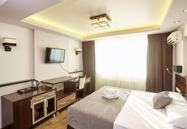 Улучшенный (до 20кв. М) однокомнатный номер и совмещенный санузел с ванной или душем, фен, гигиенические средства, косметические средства, полотенца, тапочки; сушилка для белья). В номере кровати 2 раздельные или двуспальная кровать кровати, раскладное кресло, тв, мини-холодильник, сейф, wi-fi, чайник. В "кавказ групп" каждый номер уникален, поэтому площадь номера и цветовая гамма могут отличаться. Вид-на город/во двор