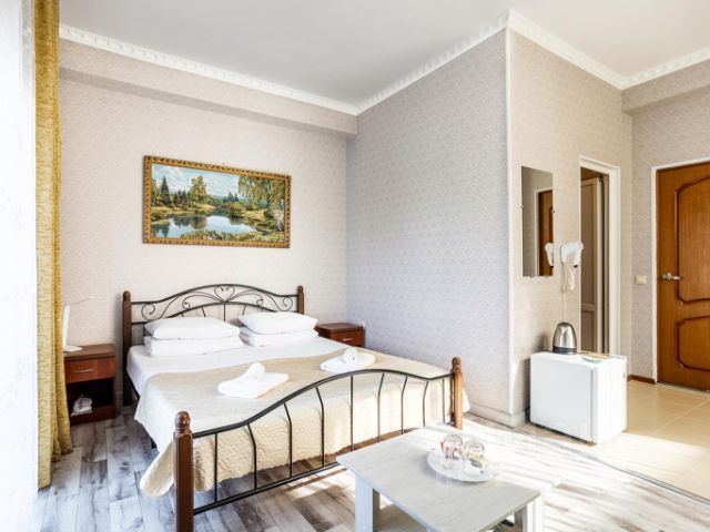 Гостевой дом ELION располагается в Сириусе (имеретинский курорт, олимпийский парк) в самой популярной локации среди туристов и гостей курорта. Находится на центральной улице микрорайона "Совхоз Россия" всего в трех минутах от моря и 15 минутах от Олимпийских достопримечательностей и знаменитого Сочи парка с его поющими фонтанами и аттракционами. Еще одним преимуществом несомненно является оборудованная мебелью и шезлонгами терраса с видом на Горы. К услугам гостей гостей представлены 25 номеров. Во всех номерах предусмотрены - удобные кровати, кондиционер, холодильник, телевизор, фен, принадлежности для душа, смарт замок. На территории гостевого дома гости могут посетить круглосуточный супермаркет, кафе. Есть возможность заказать доставка еды в номер круглосуточно и воспользоваться прокатом велосипедов и самокатов. Уютный двухместный бюджетный номер подходит для комфортного проживания 1-2 человек, в нём возможны 2 односпальные кровати или одна двуспальная, так же для детей до 14 лет, возможна установка дополнительного спального места (кресло-кровать), Номер оснащен кондиционером, телевизором, холодильником, шкафом и 2 тумбами. В собственной ванной комнате есть всё необходимое для вашего удобства (фен, набор белоснежных полотенец, пляжные полотенца, шампунь, гель для душа, жидкое мыло, тапочки, туалетные принадлежности, халат (по требованию). Окна номера выходят в холл.