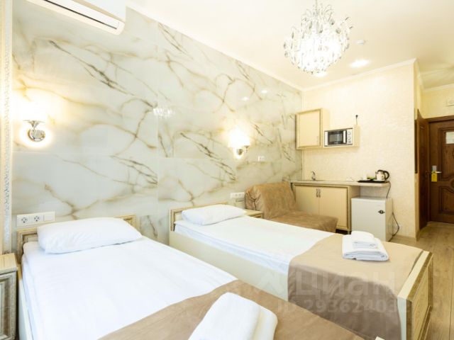 Уютный однокомнатный номер площадью 23 кв.м. с видом на одну из центральных улиц города, в котором созданы все условия для комфортного отдыха: две удобные односпальные кровати, которые при необходимости могут быть сдвинуты и превращены в комфортную двуспальную кровать, прикроватные тумбы, туалетный столик, зеркало, пуфик, кресло, журнальный столик, шкаф-купе. Номер оснащен кондиционером, холодильником, ЖК телевизором, высокоскоростным Wi-Fi, комбинированной системой освещения (потолочное, настольное, прикроватное и пр.), сейфом. Санузел оборудован душевой кабиной, раковиной с большим зеркалом, туалетом, гигиеническим душем, современной сантехникой. Номер визуально разделен на спальную зону и зону отдыха.