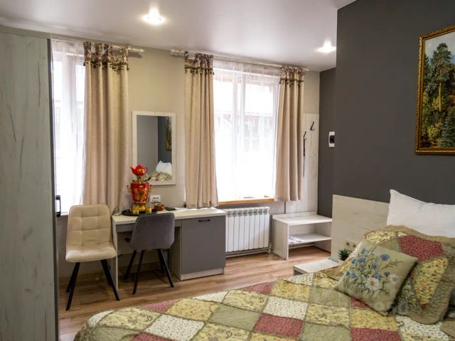 Комфортный, оформленный в русском стиле однокомнатный номер с двуспальной кроватью, раскладным креслом и окном с видом на горы или во внутренний двор отеля. Услуга по размещению в номере домашних животных (собака до 7 кг) подлежит дополнительной оплате в размере 1 500 (тысяча пятьсот) рублей в сутки с октября по апрель включительно и 2 000 (две тысячи) рублей с мая по сентябрь включительно. Также вносится возвратный депозит 5000 рублей.