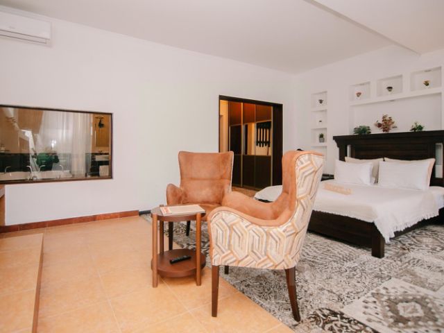 Двухместный номер Бассейн Один ребёнок до 4 лет — можно без отдельного спального места. Уникальная атмосфера. Недалеко от номеров этой категории протекает горная река, шум которой создает уникальную атмосферу спокойствия и умиротворения. Вы сможете наслаждаться звуками природы прямо из вашего номера — идеальная обстановка для отдыха и релаксации. Кровати на выбор: кровать king size шириной 200 см или две односпальные кровати обеспечат вам отличный сон и отдых после активного дня. А кондиционер, холодильник, жк телевизор и собственный санузел с душем обеспечат ваше удобство. В стоимость номера включены бесплатный wi-fi и пользование большим подогреваемым бассейном. По запросу предоставим утюг и гладильную доску и сушилку для одежды.
